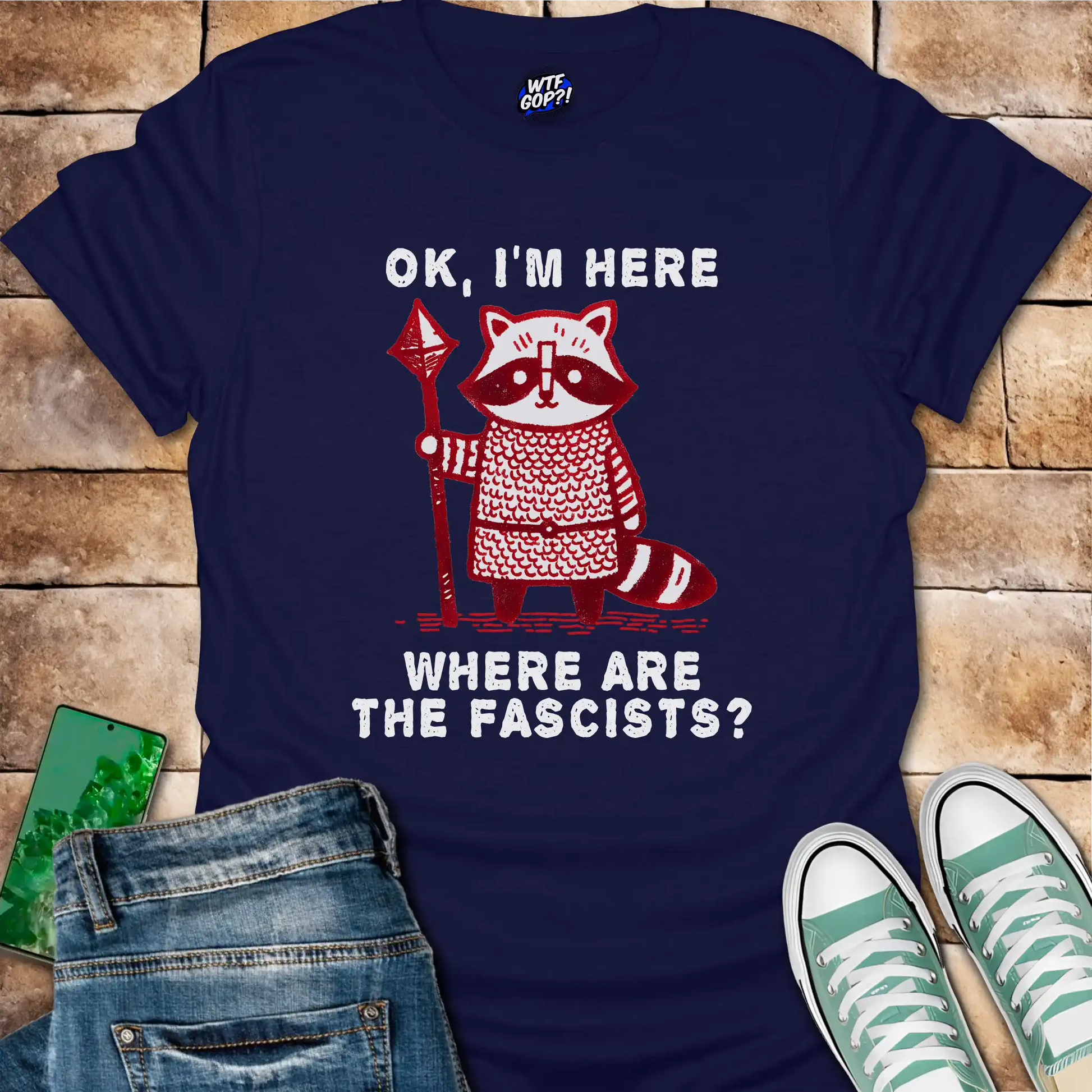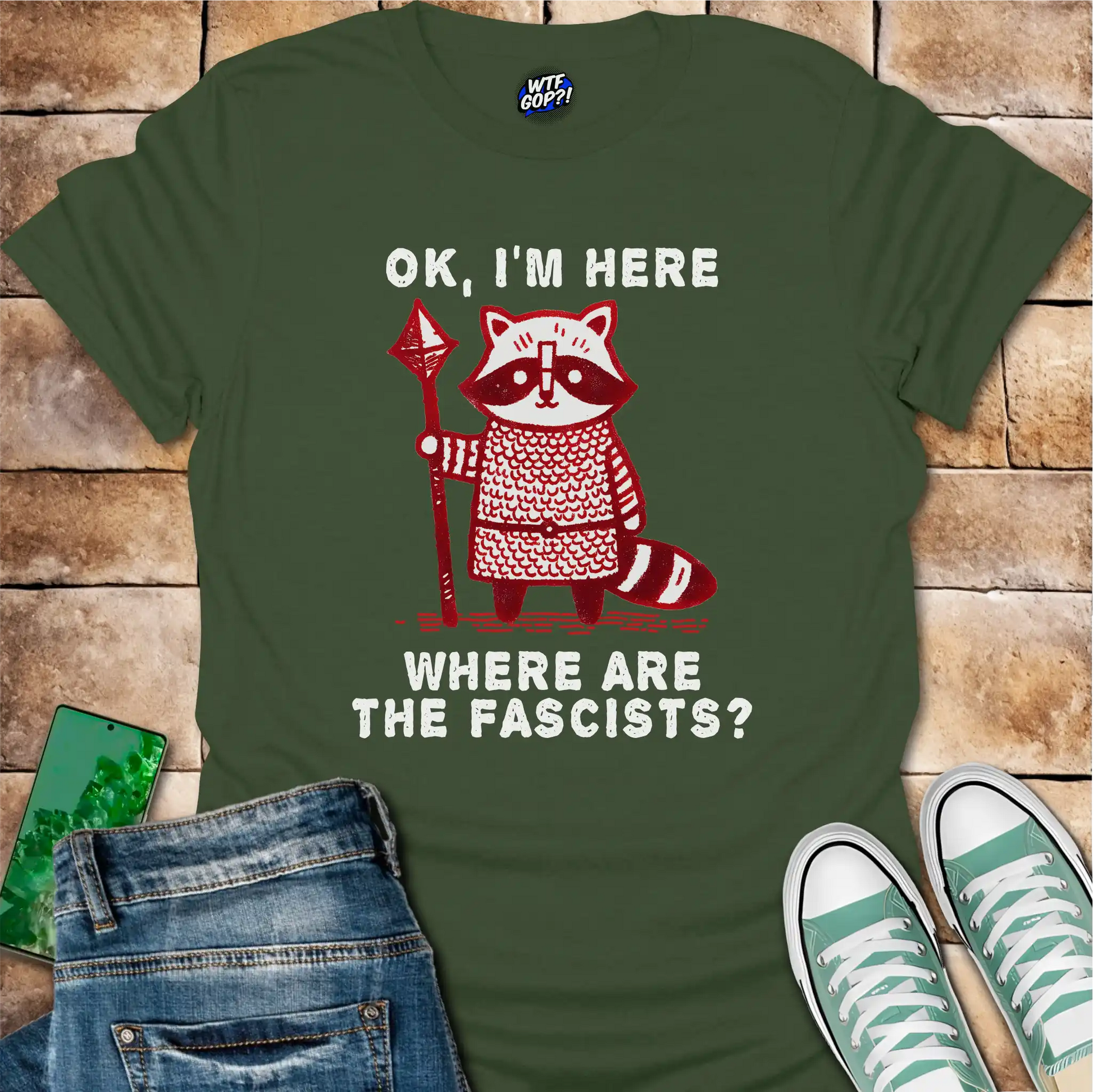 Tired of waiting for someone else to deal with the rising tide of... well, you know? Our "Anti Fascist Raccoon Shirt" is here to recruit you! Featuring a determined little masked crusader, spear in hand, asking the ever-important question, "OK, I'M HERE WHERE ARE THE FASCISTS?", this tee is for anyone who's ready to roll up their sleeves (or at least their shirt sleeves) and get to work. This isn't just clothing; it's a call to action, a humorous yet firm declaration against authoritarianism, and a reminder that even the cutest critters are on high alert. Wear this Anti Fascist Raccoon Shirt to protests, town halls, or simply while reorganizing your sock drawer – vigilance is key, everywhere!