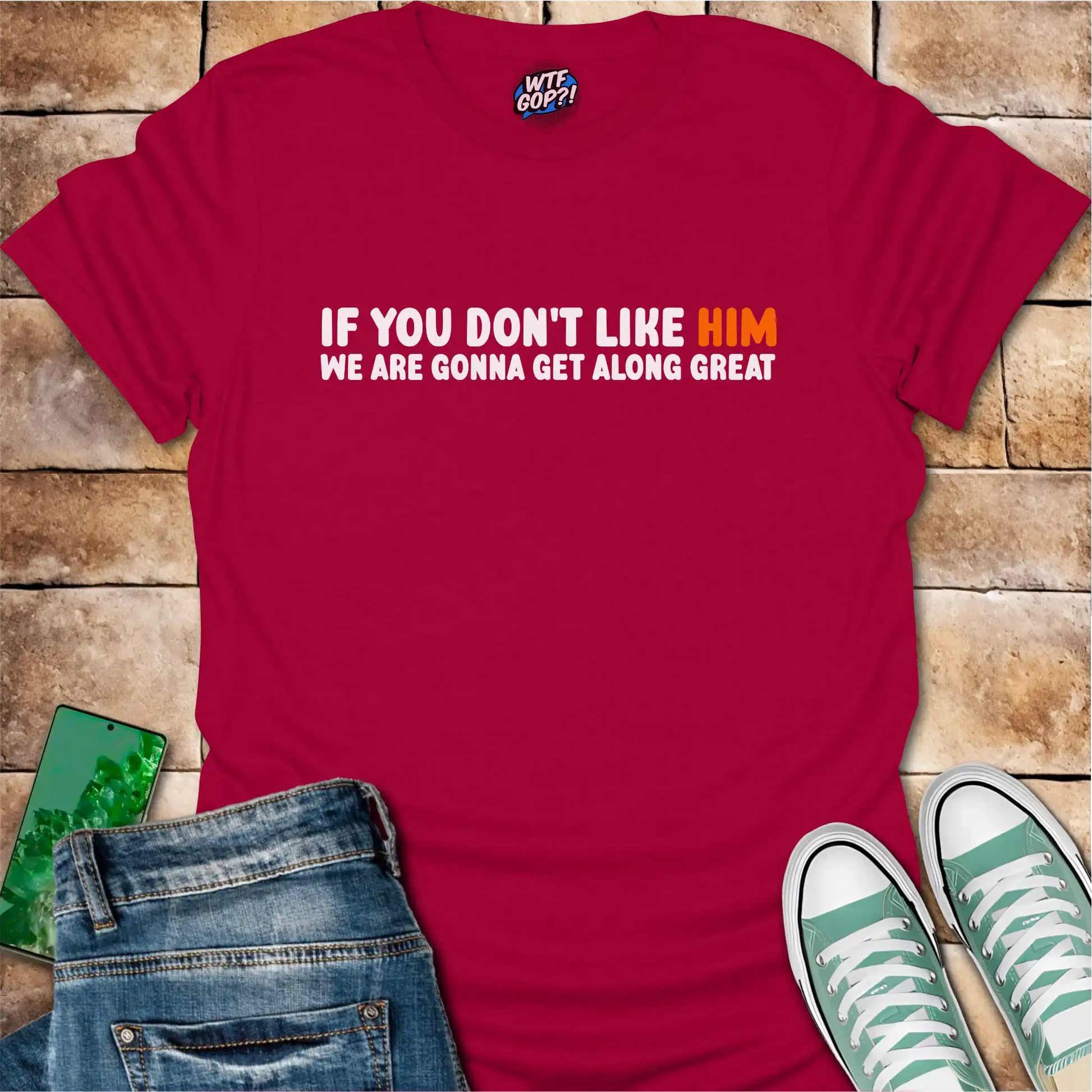 Nothing says "let's be friends" quite like shared political opinions. Our Anti-Trump Friendship Shirt cuts straight to the chase with its humorous yet pointed message: "IF YOU DON'T LIKE HIM WE ARE GONNA GET ALONG GREAT." With "HIM" highlighted in unmistakable orange, this shirt lets everyone know where you stand without having to waste time on awkward political small talk.